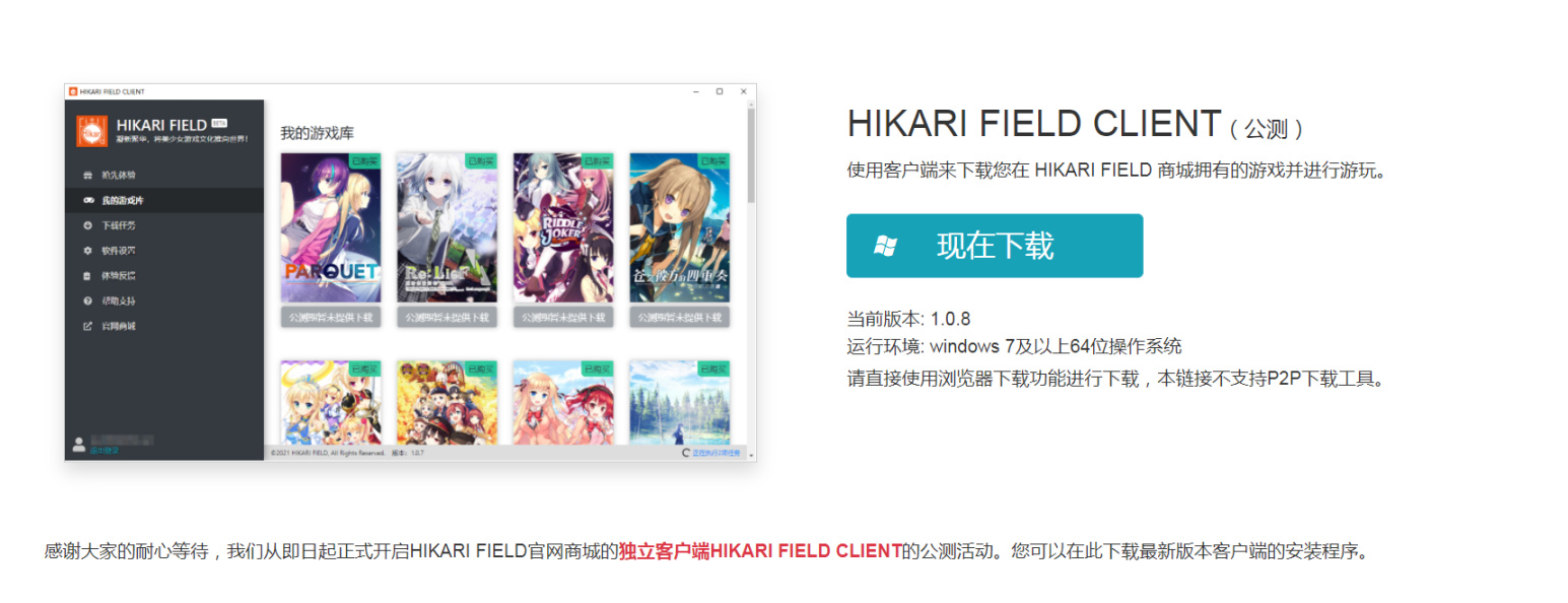 本周,HIKARI FIELD官网商城客户端HIKARI FIELD CLIENT的公测活动正式开启。目前客户端内提供了《魔卡魅恋!零之编年史》和《Happiness!2樱花盛典-试玩版》两部免费作品。