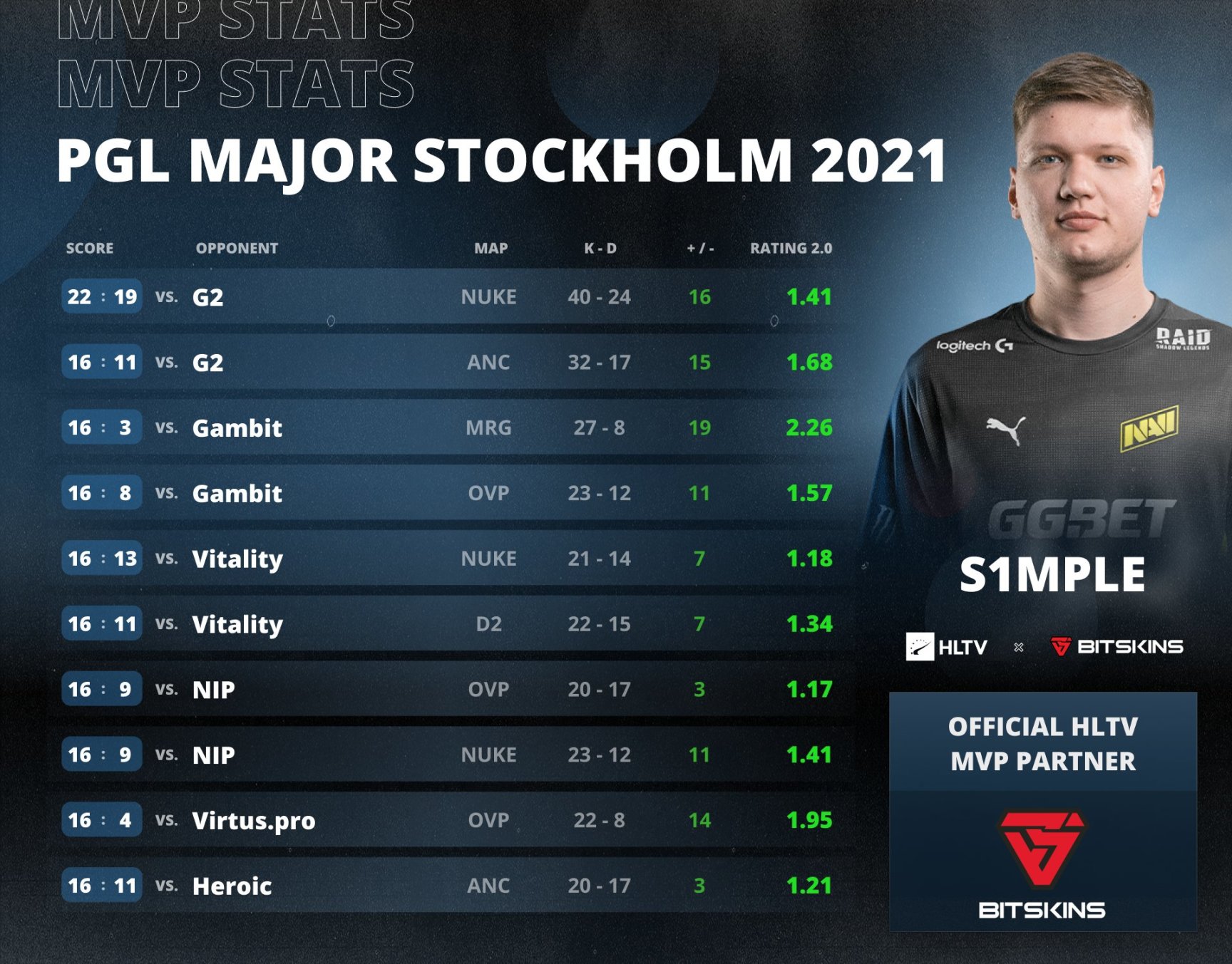 在决赛之前,他的队友B1T和electronic以及G2的明星选手NiKo是s1mple在MVP之路上的主要竞争对手。但在决赛之后,s1mple以1.47的平均rating无可置疑地超越了所有竞争对手拿到了MVP奖牌。