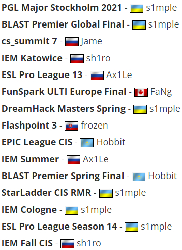 以下是2021年所有大赛的MVP: