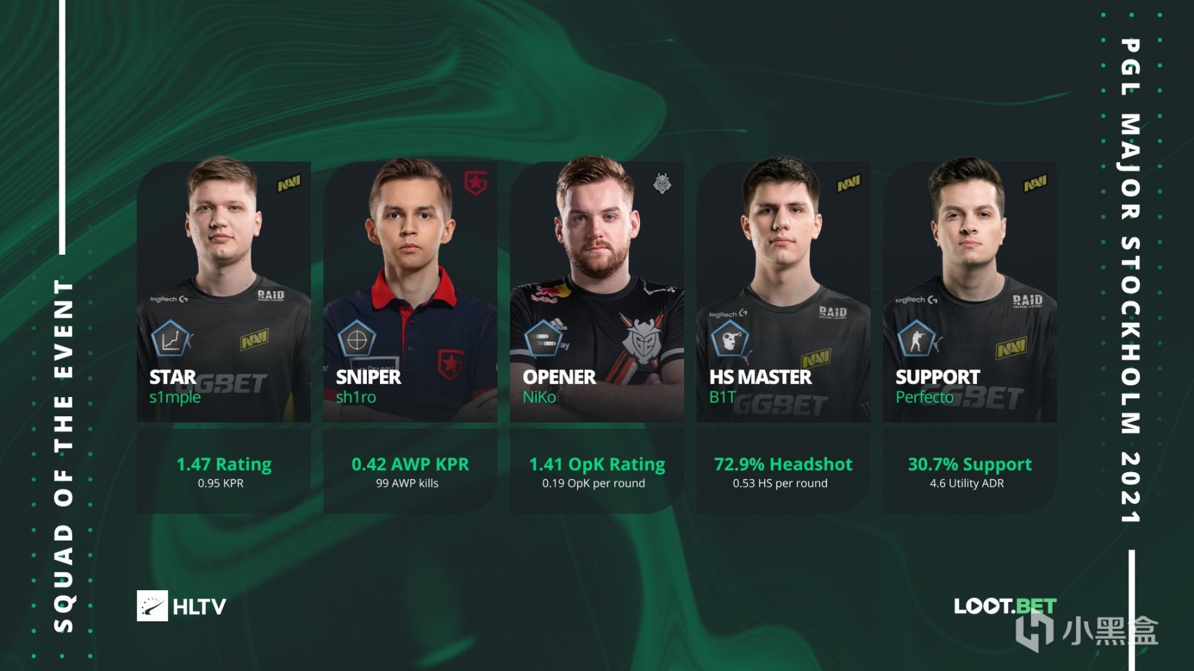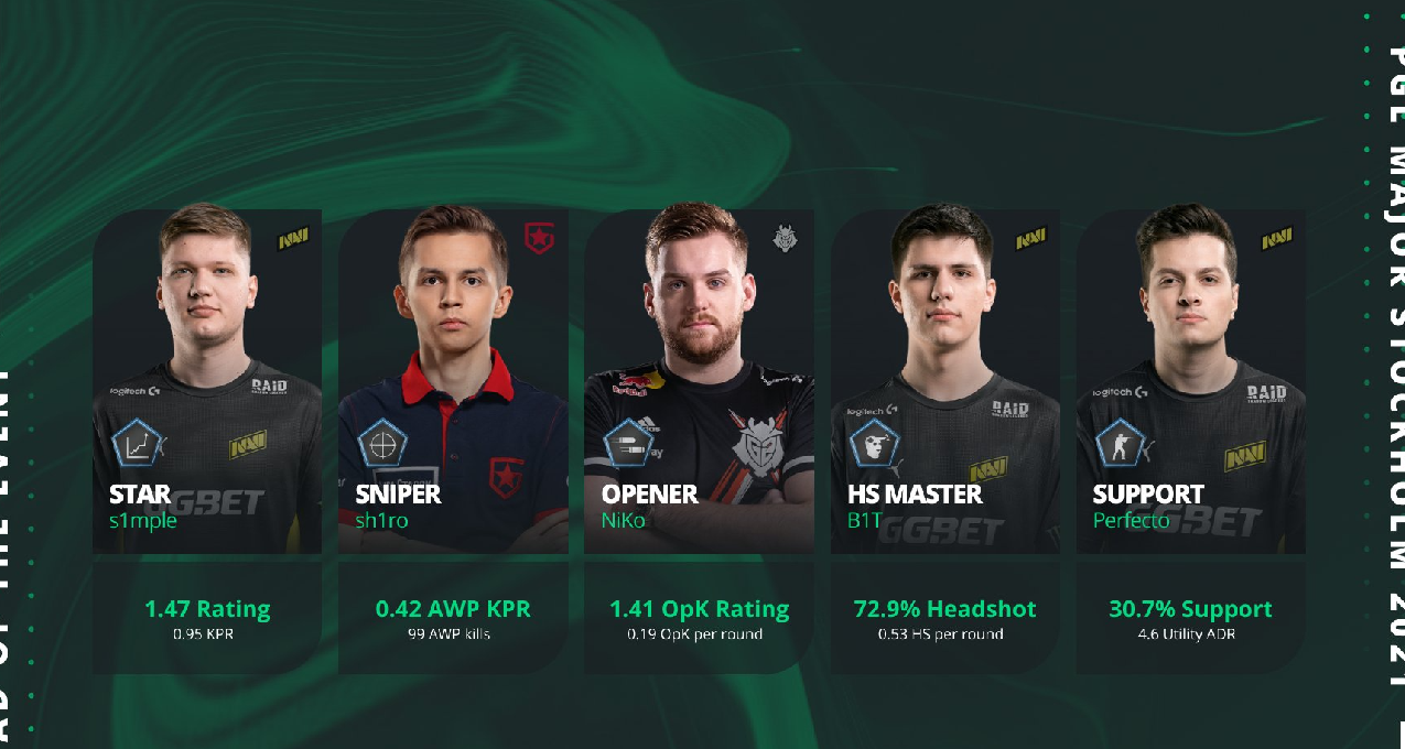 在HLTV评选出的PGL Major最佳阵容中,五名选手全部来自四强队伍,其中获得MVP的s1mple以本届比赛优异的表现占据一席之地。来自G2的Niko虽然最终未能带队夺冠,但个人表现足够优秀,他在impact rating,每局首杀数,总爆头数,每回合平均伤害量等关键数据上排名所有选手第一,足够保证他入选最佳阵容。小将B1T第一次参加Major赛事就有亮眼数据,72.9%的总爆头率和每回合0.53个爆头让人印象深刻。最佳阵容的狙击手是来自Gambit的sh1ro,他在每回合能拿到0.42个狙杀,并在全比赛中通过狙击枪拿到99个人头。辅助位是NAVI的Perfecto,他在KAST和Support round这两项辅助数据中排名所有选手第一。