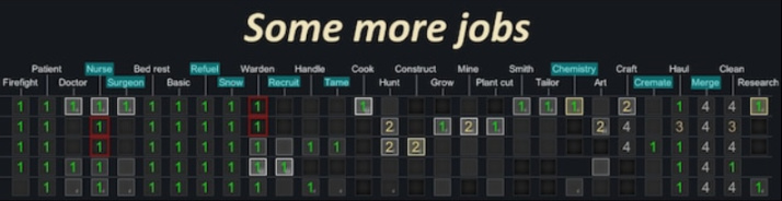 细化了原版简单粗暴的分工方式,将原版诸如医生的职务包括了照顾病人、医疗病人、为病人做手术等专业与非专业工作,与给酿酒桶补充麦芽和填充弹药等明显不同类型的分工区分开来。节省人力的同时,提高了效率,堪称强迫症福音。