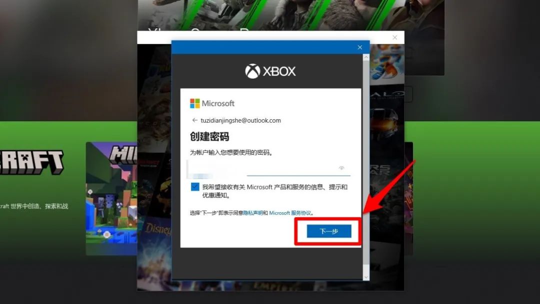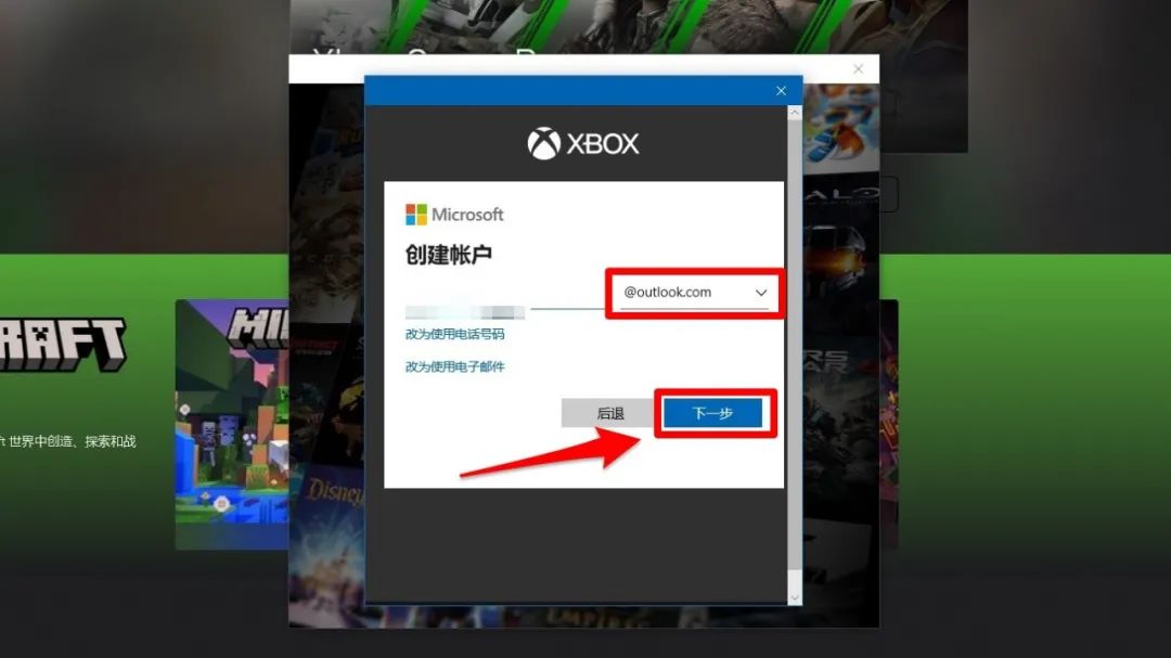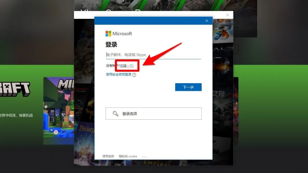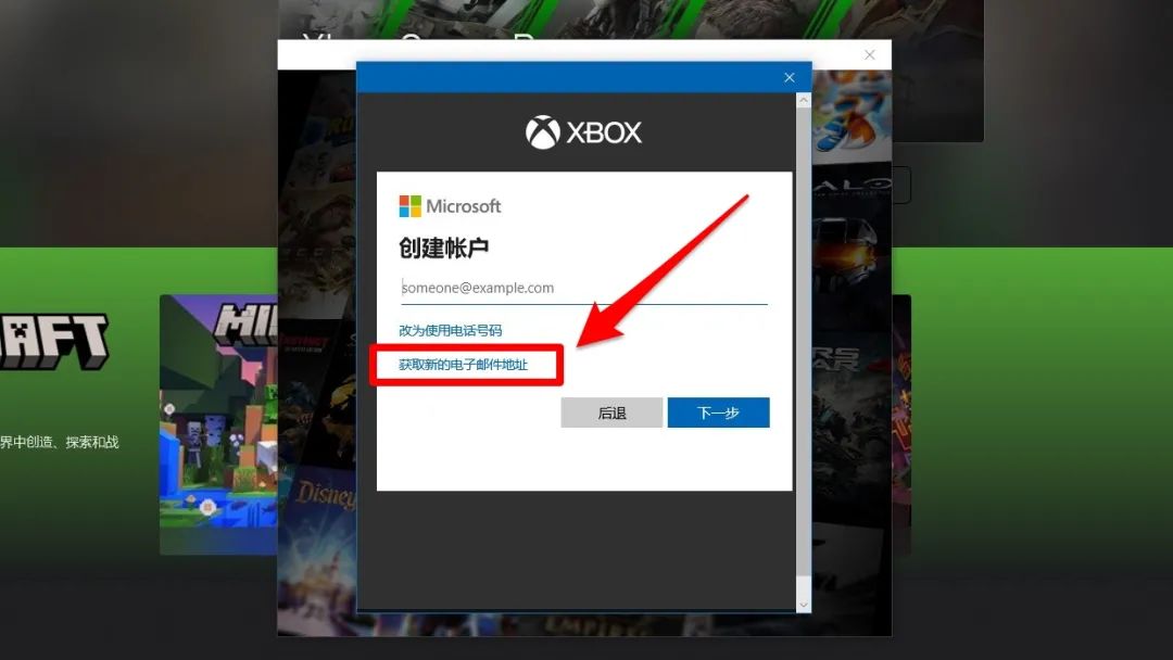 9、点击“创建一个”点击“获取新的电子邮件地址”这里后缀我们选择“@outlook.com”前面的部分按自己的喜好填写即可。输入后点击“下一步”。