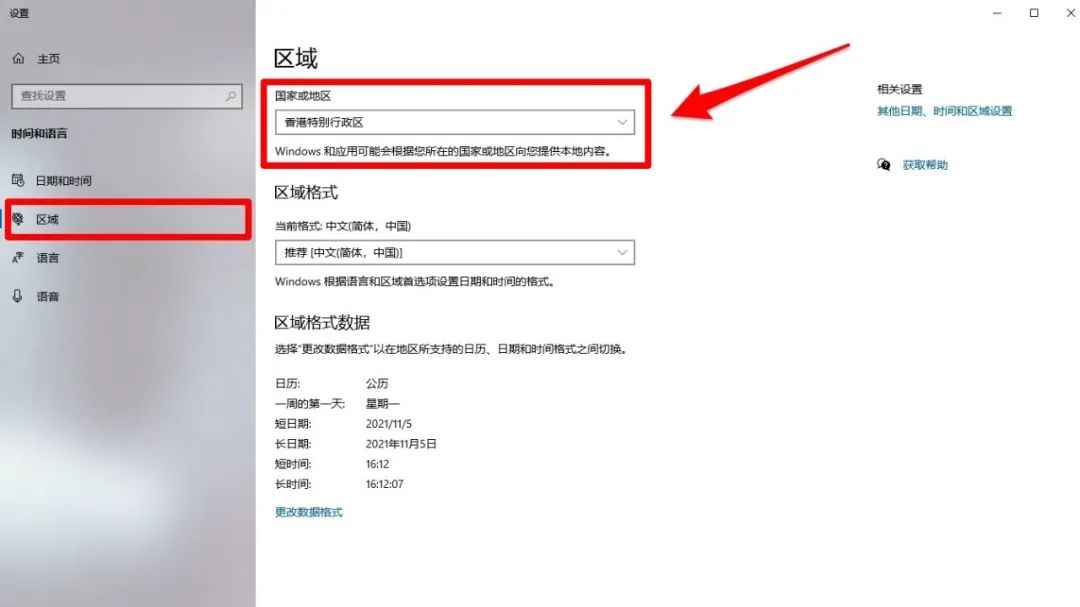 5、安装完成别急着打开,先打开系统的区域设置(不知道的可以用系统自带的搜索工具搜索一下),将“国家或地区”这一栏改为“香港特别行政区”。(这一步必不可少,不然可能打开Xbox后什么都加载不出来,所以一定要改过来)