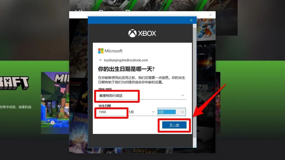 12、这里“国家/地区”我们选择“香港特别行政区”,出生日期只要保证你填入的这个年龄现在大于18岁即可,为了保险起见可以填大一些。