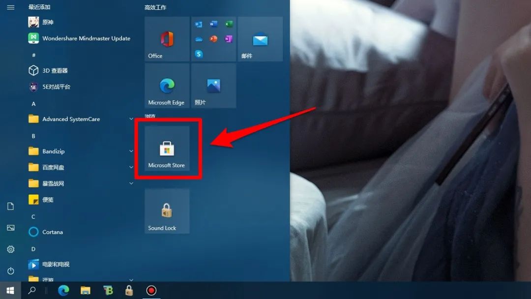 2、找到你电脑中的微软商店。(如果家里网络不太好的话可以准备一个加速器,后面有可能会用到)