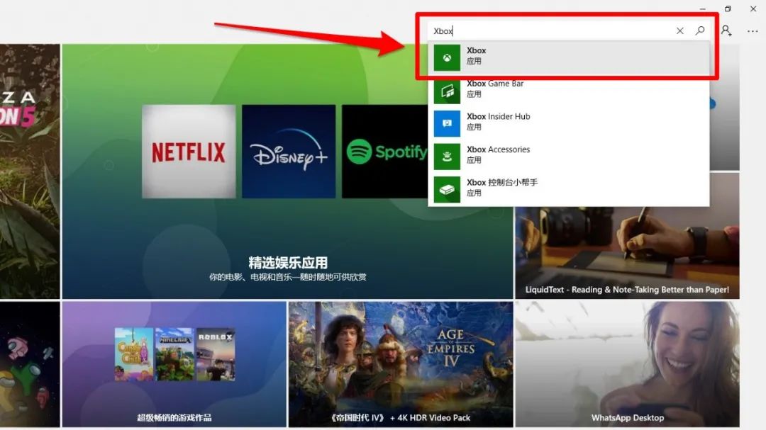 3、在右上角的搜索栏中搜索Xbox。