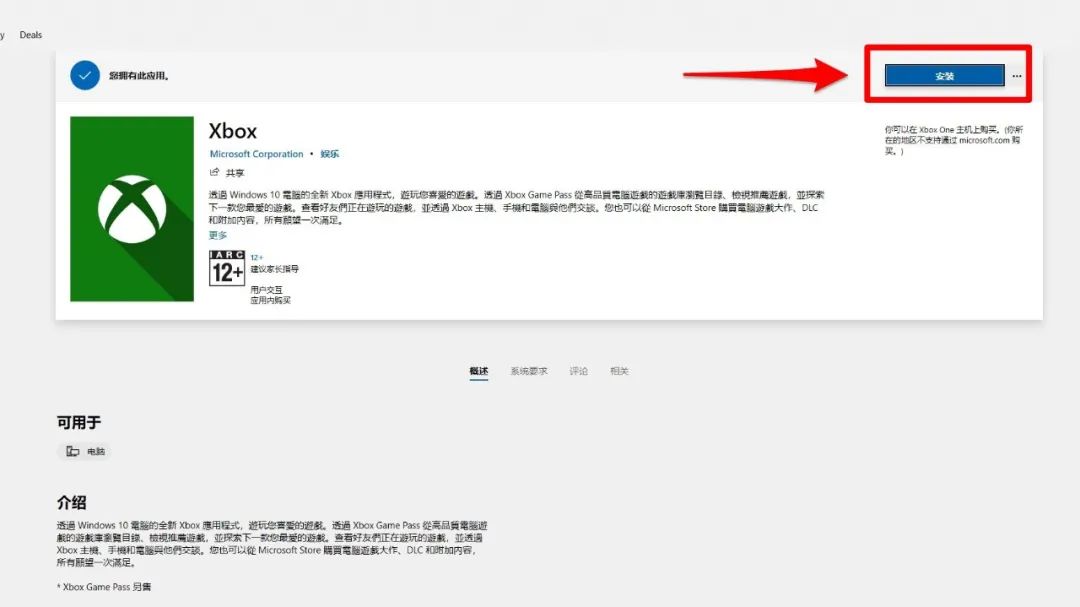 4、进入Xbox页面后点击“获取”、之后点击“安装”,等待下载安装完成。