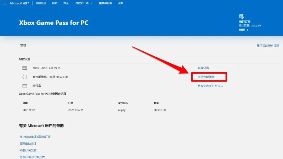 20、进入页面后点击XGP后的“管理”,之后点击“关闭定期账单”。
