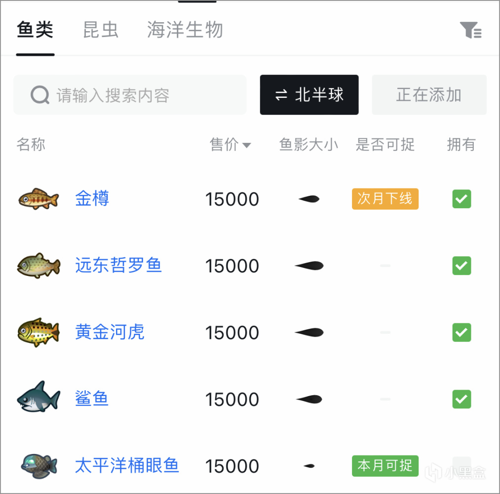 我们翻新了百科的生物图鉴功能,现在可以根据实时日期查询可捕捉的生物。针对每个生物,右侧增加了收集标记,可以直接筛选已拥有/未拥有的生物进行查阅~