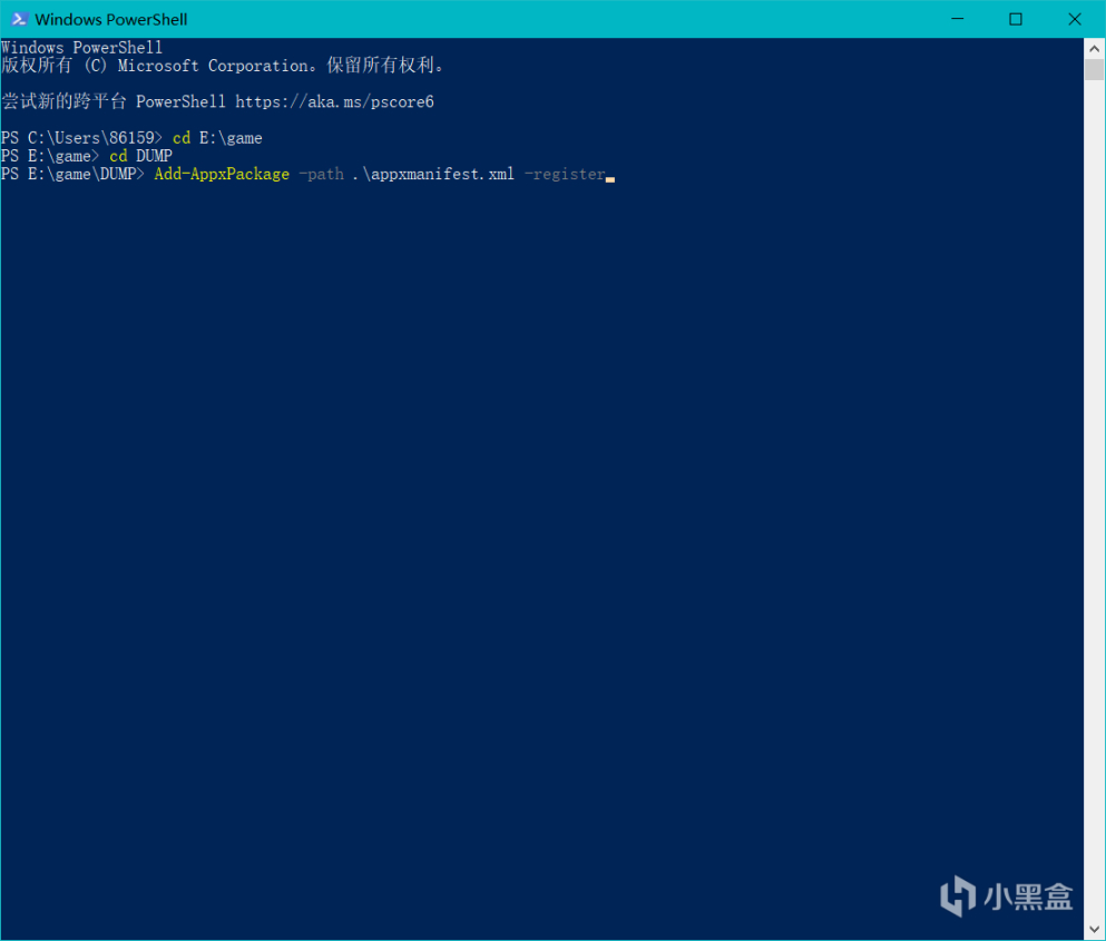 用cd命令进入你转移的游戏文件(我是DUMP),然后输入Add-AppxPackage -path .\appxmanifest.xml -register ,等待片刻。
