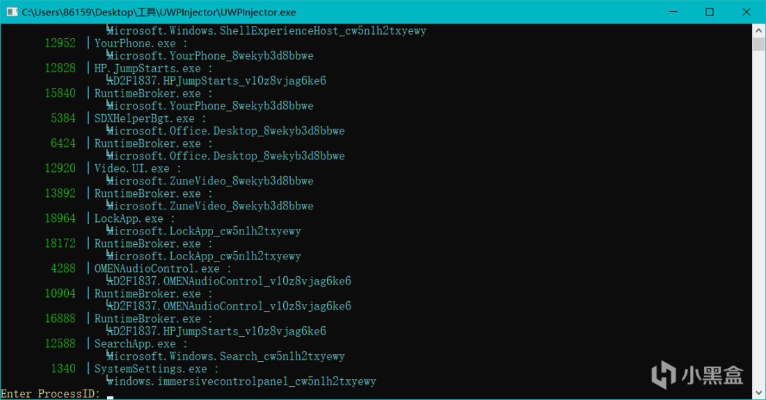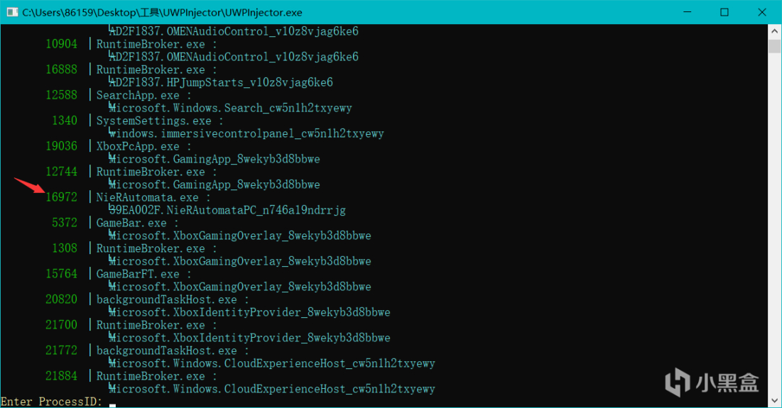 步骤3:打开游戏,保持游戏后台运行的同时打开下载好的UWPInjector.exe。找到游戏进程的PID。