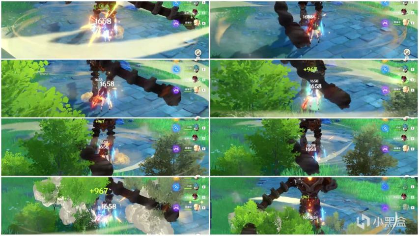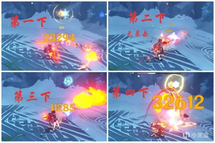 同理胡桃的普攻也是如此,胡桃一下重击会有四个伤害打在怪身上,按先后顺序如图
