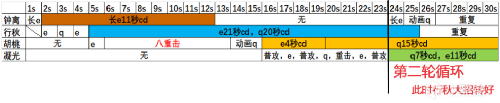 钟离长e,行秋eqe,胡桃e八重击q,凝光普攻e普攻q重击e普攻,下一轮。