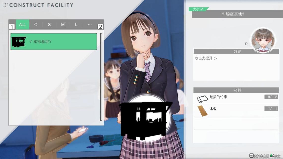 游戏还引入了开发学校设施的功能,在四周被水环绕的学校里,美少女们也有一些兴趣爱好以及想要的设施,玩家可以根据少女们的请求来制造她们所需要的设施,制作设施也需要一些材料,而制造出设施以后不但可以给校园增添一些热闹,还有着对少女们的buff加成,并且一些设施有套组效果,额外增加效果的加成。