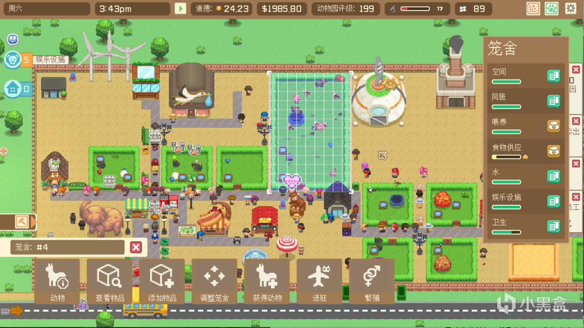 获得动物后,在动物园搭建围栏,放置动物后为动物提供饲料、饮水、玩乐设施,随着围栏里动物的增加,所需求的三项指标也会逐渐增加,大型动物对于围栏大小也会有要求,随着后期动物的获取,需要搭建草地、沙漠、冰原等围栏。