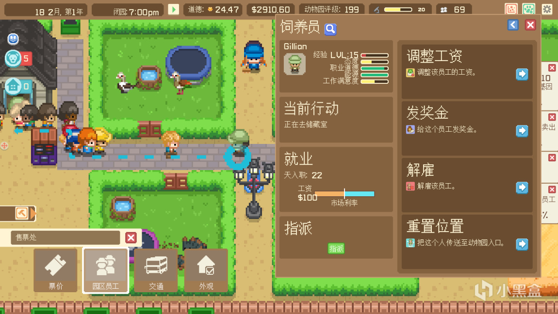 《动物园》的维持也需要大量的员工,可以招募饲养员、清洁工、研究员、店主、吉祥物、繁育员等员工,每一名员工也都有自己的属性、星级,不同的属性也会影响员工的积极性和事态的处理。通过指派员工前往固定围栏,可以有秩序的保证围栏正常运营。