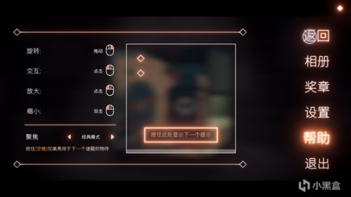游戏一开始就是一个透明的立方体中摆放着一台相机,通过一段简单的游戏操作教学,游戏开始.游戏的操作很简单,旋转,交互,放大和缩小,需要利用调节视角,触发机关,解开谜题.