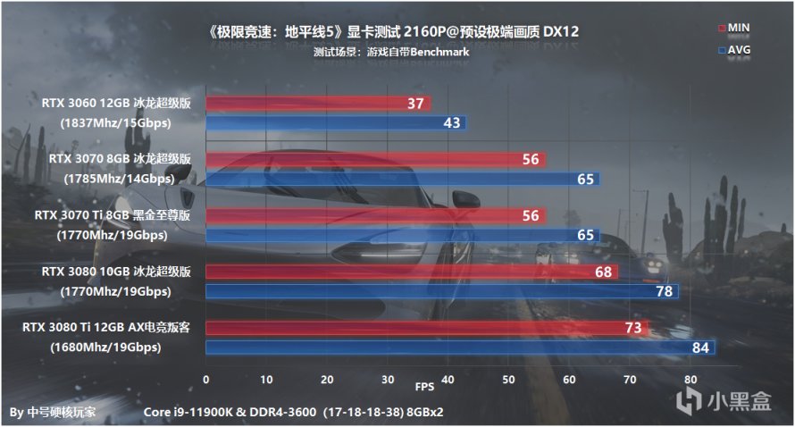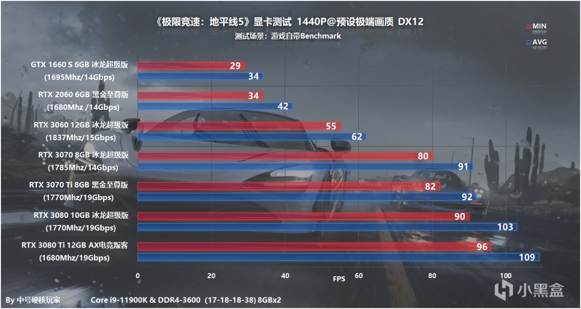 在《极限竞速:地平线5》中,推荐RTX 3060 12GB冰龙超级版,2K预设极端画质,平均帧率可以达到62fps,游戏中温度控制在60℃出头,标称Boost频率为1837Mhz,实际会比公版会高一点。