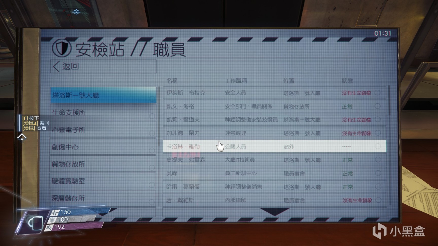 掠食是如何做到的呢,首先是细节满满的游戏世界,在游戏中我们经常会需要去寻找某人身上的某些物品,但游戏并不会直接告诉你此人是谁,位置在哪。但掠食中的每个NPC都有名有姓,还有自己的工作岗位,玩家能在安全终端追踪到每一位NPC的位置,这就让玩家在寻找物品时有一个基础的方向。