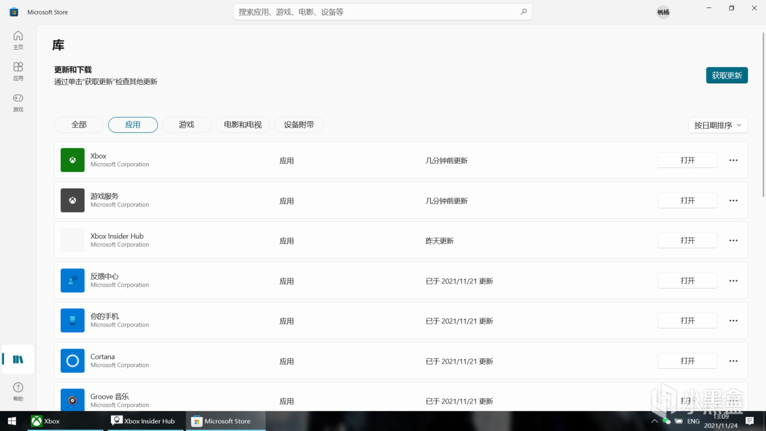 3.进入微软商店,点击左下角库,如图,在库中看到xbox、xbox insider hub,点击更新