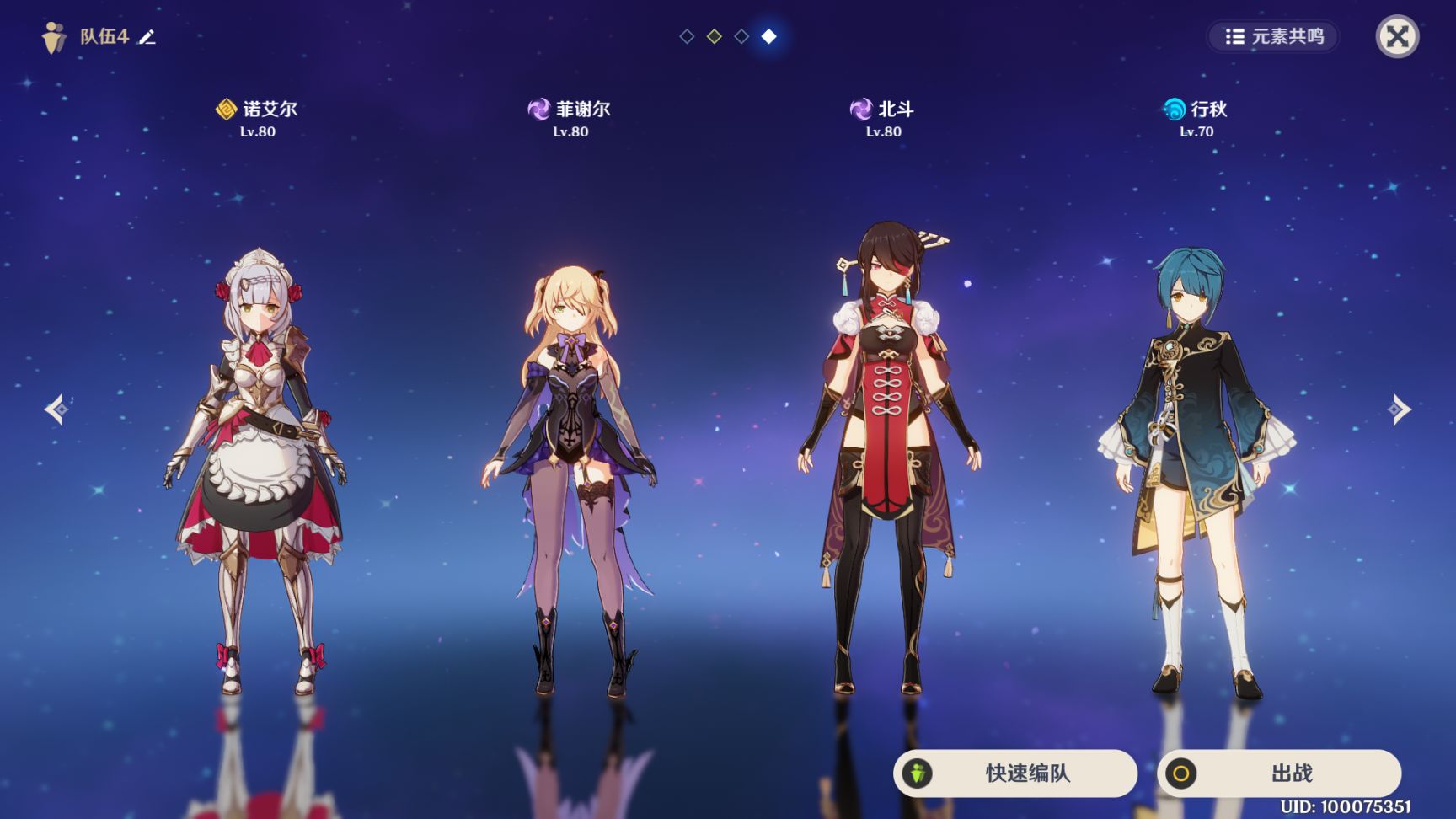 流程手法:北斗qe切行秋qe接小艾米e(或q)换女仆出来输出。