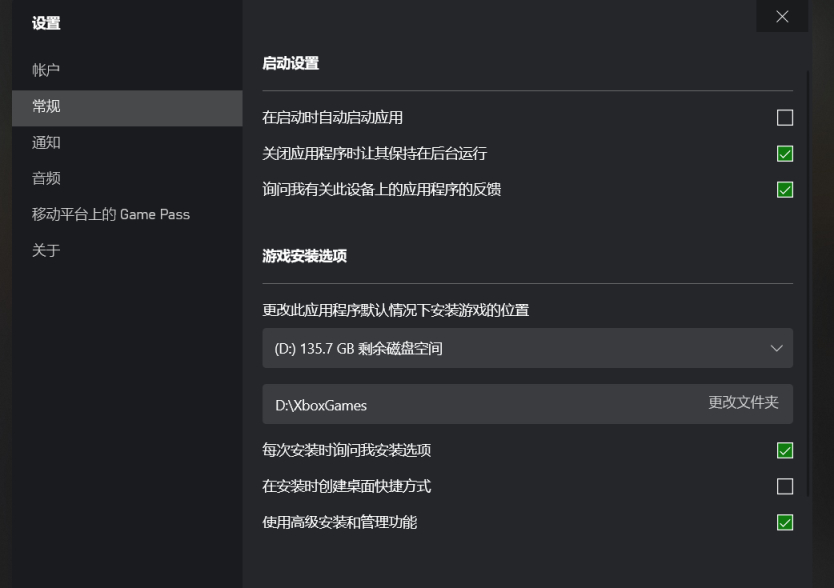 5.更新后打开xbox点击设置在常规里出现使用高级安装和管理功能字样,勾上它之后就能在xbox里管理文件夹了。(默认自动创建xboxgames文件夹)