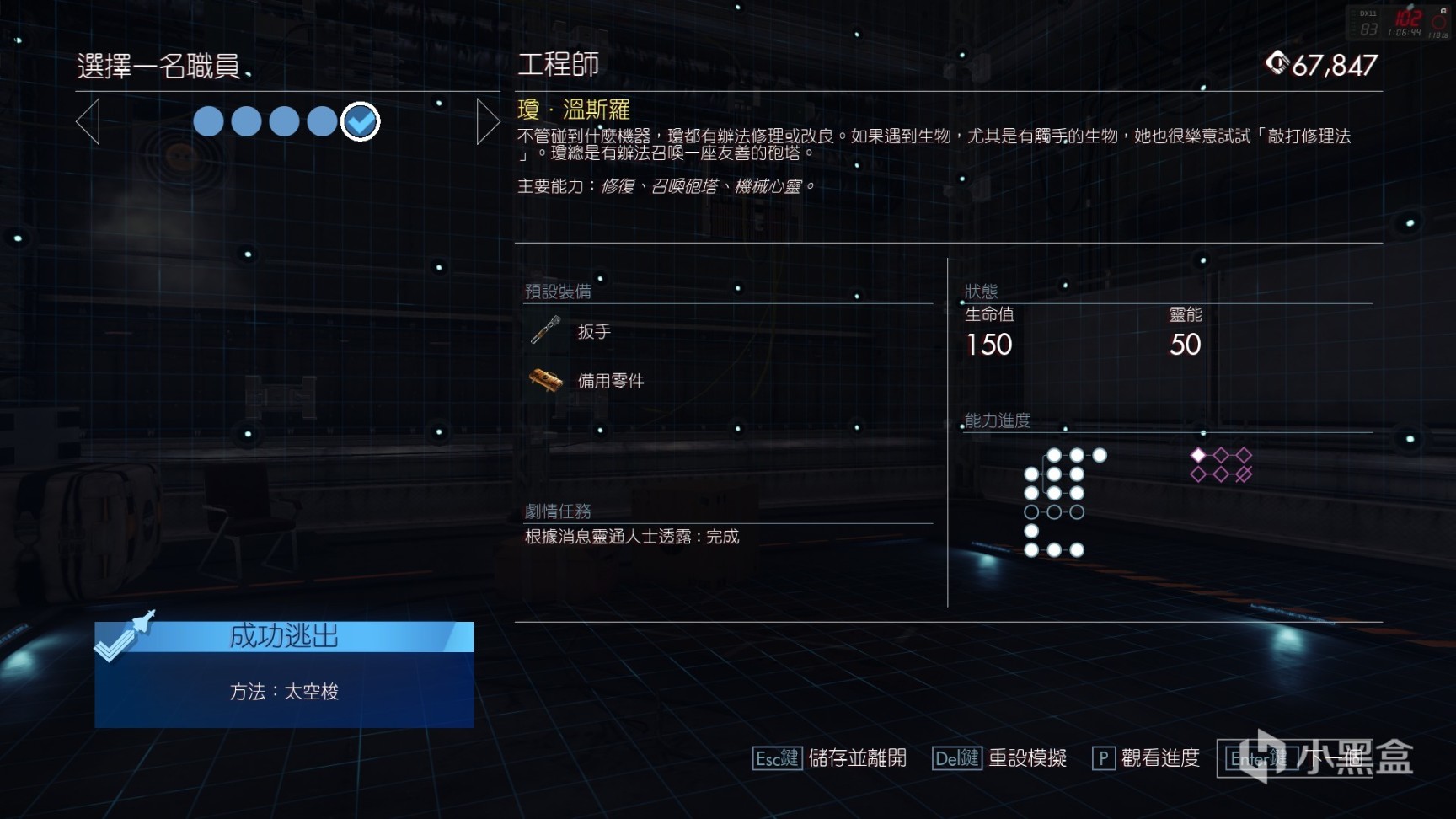 工程师是第一位解锁角色,她和志愿者的能力完全相反,灵能系能力屈指可数,但拥有极强的场景解密能力“修理”,极高的生命值和最大的背包,还有可以无限生成的炮塔。