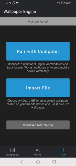 第 2 步:在您的 Android 设备上打开 Wallpaper Engine,然后单击右下角的添加按钮。 选择与计算机配对,此时您的计算机应该会出现在设备列表中。 选择您的计算机,然后输入第 1 步中的 4 位数 PIN。