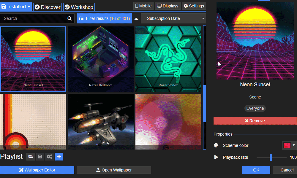 随着时间的推移,我们收到的一个普遍请求是每个工作日配置一张壁纸的方法。 在本次更新中,我们引入了新的工作日播放列表。 只需在 Wallpaper Engine 的已安装选项卡中将最多七张壁纸添加到播放列表,然后在播放列表部分单击配置并从中选择星期几选项。 您还可以在其中找到现有的播放列表选项,例如当日时间播放列表类型。