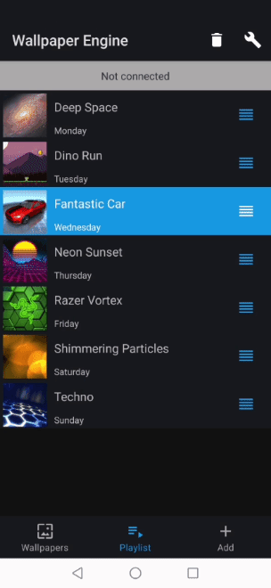 从技术和法律的角度来看,从移动设备直接连接到创意工坊是不可能的。 但是,我们构建了一个便利的系统,可让 Wallpaper Engine 的所有者从 Windows 上轻松地将壁纸传输到 Android 设备: