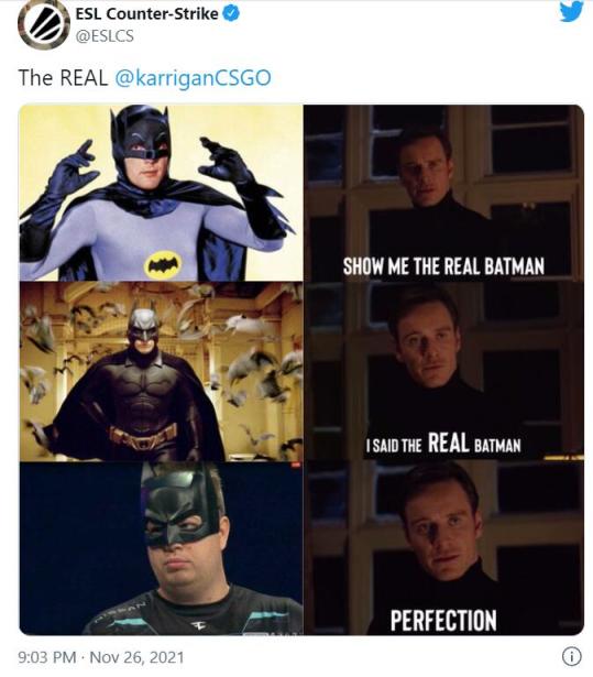 FaZe Clan在BLAST Premier秋季总决赛可谓是焕然一新,队服有着非常独特的风格。在这场比赛体育馆的开幕式上,队员karrigan以独特的方式入场。FaZe Clan的新蝙蝠侠联动队服或许给这位指挥的大脑带来了什么灵感,他决定带着蝙蝠侠的面具出场,摆着大展双臂的姿势,正如同这位超级英雄展翅的身姿一般。