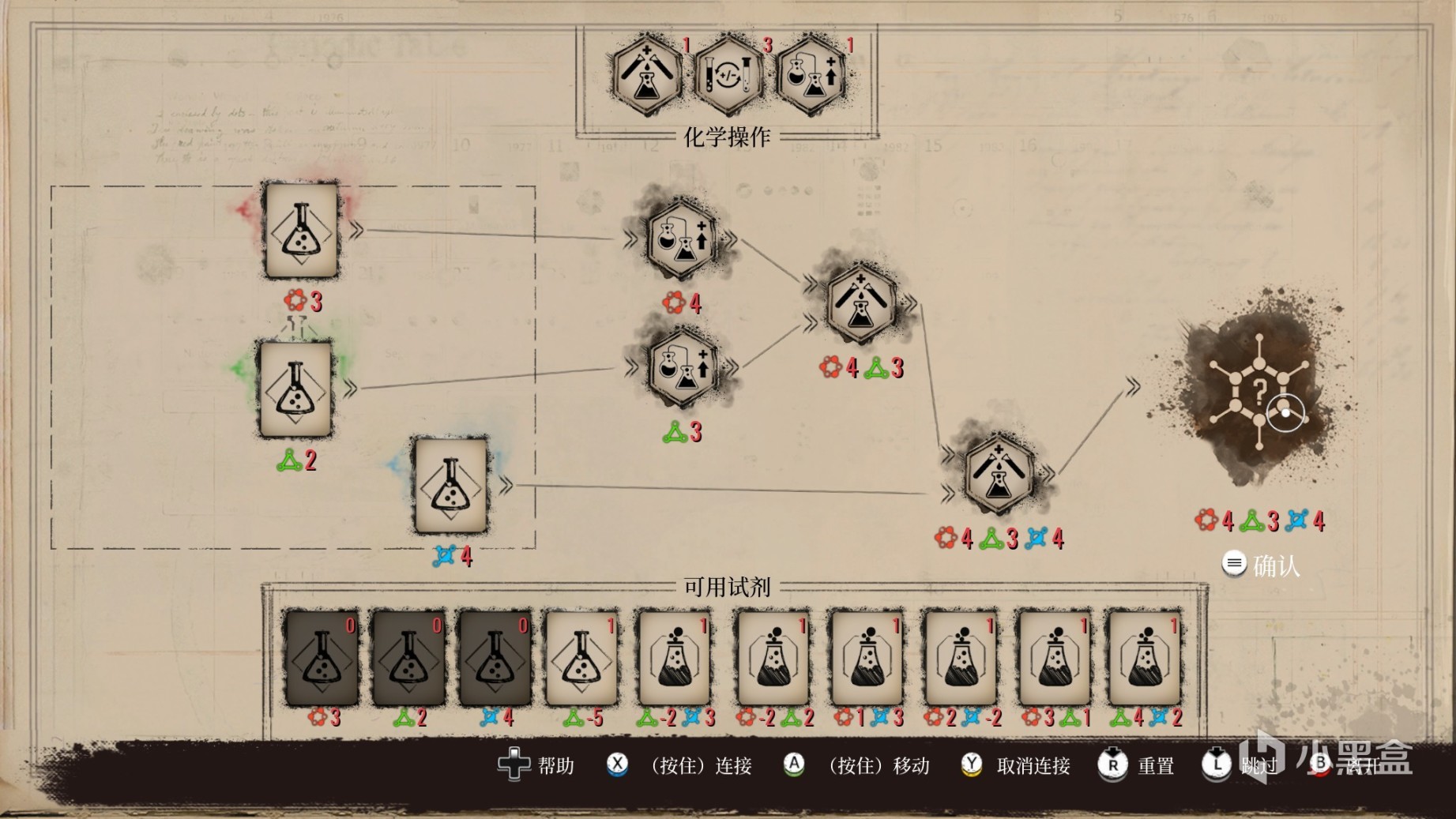 在福尔摩斯最为闻名的“基本演绎法”中,对于化学的应用是重要的一环——他可以分辨出嫌疑人鞋子上土壤的来源,也能分析出衣袖上污垢的成分,而在游戏中我们同样可以利用“化学方程式”来分析证物的成分:将上图底部的“成分”使用上图顶部的“公式”组合出右侧的结果即可过关,不过本质上属于数学加法运算并不具备太高的难度。