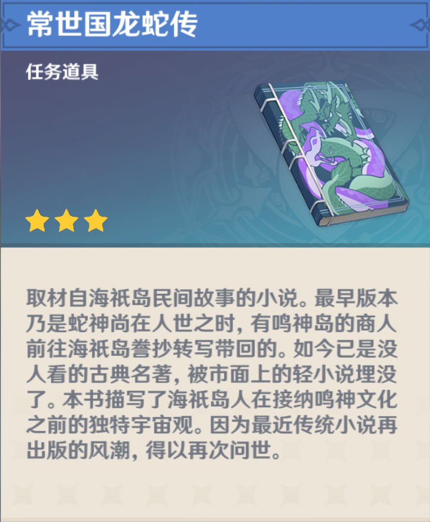 有关海祇更加久远的「渊下宫」时代历史,早先我们只知是大蛇将饱受龙嗣之苦的海祇先民自永夜国土中带往海面得以重见光明。而游戏中新增的书籍《常世国龙蛇传》则为这段时期的历史补充了非常重要、甚至可以说颠覆原先认知的线索: