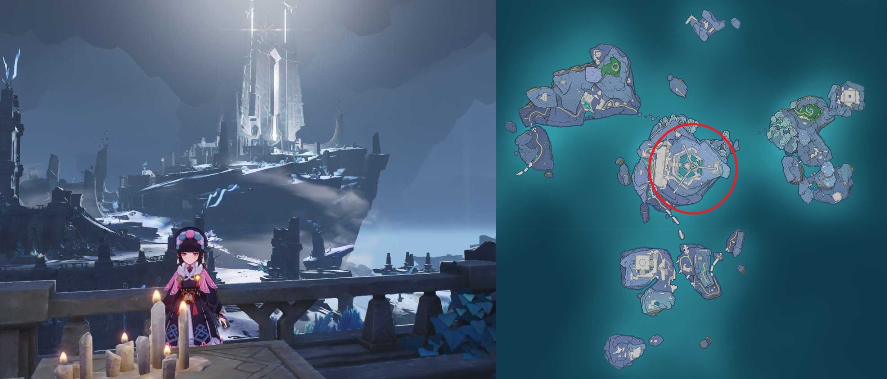 从泄露的 2.4 版本渊下宫实景图中便能看出,渊下宫如堡垒般高大壮观的建筑(应该对应渊下宫大地图中的红圈区域)明显有着发达的文明水平