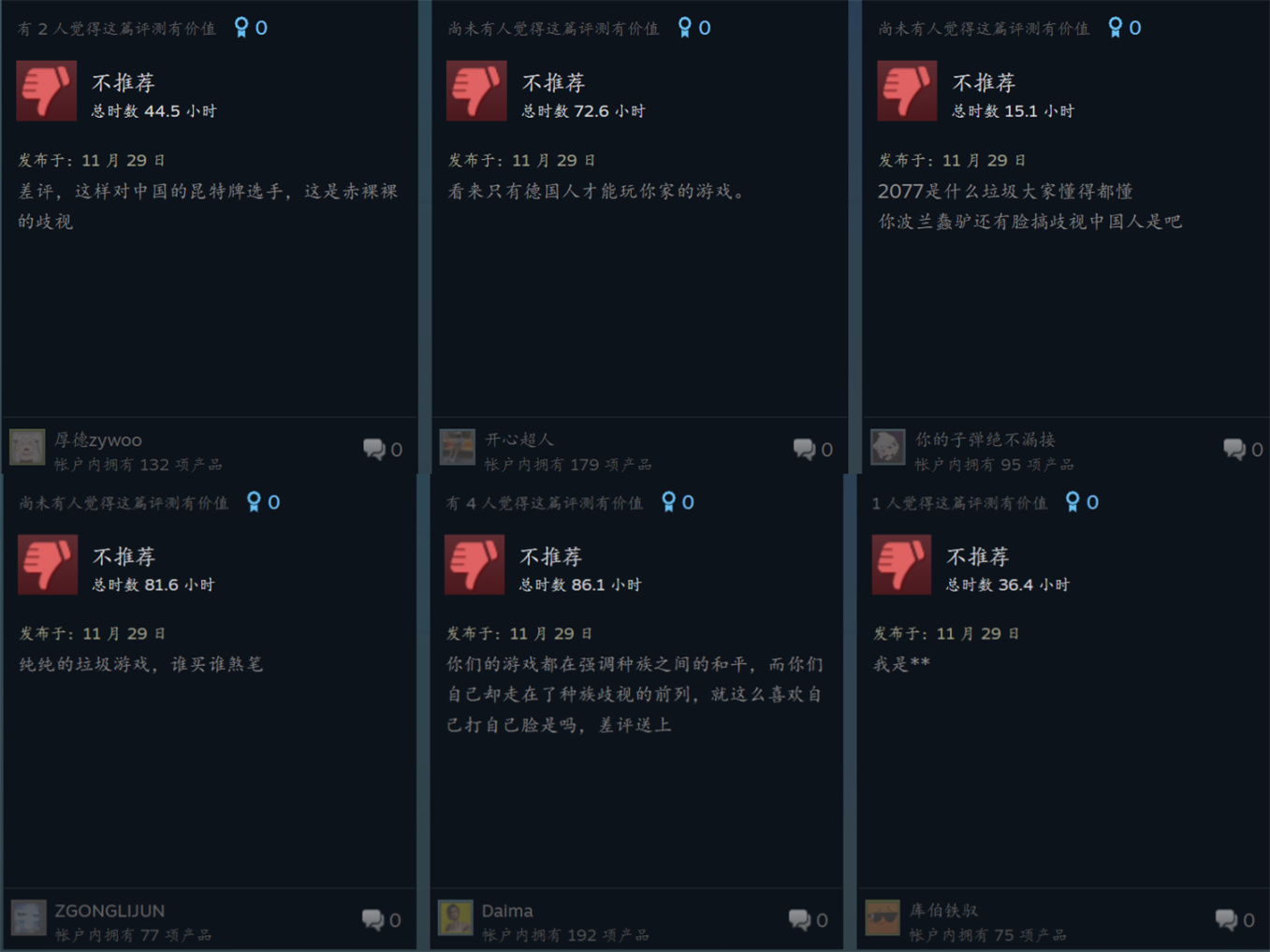 - 受限于篇幅原因,三件事件的详细过程没法一一列举,但CDPR官方在这三件事情上的处理过程中对于中国玩家的歧视和不平等却可见一斑,对于处罚的疑点置若罔闻,漏洞百出的回应更显出CDPR不加掩饰的傲慢与赤裸裸的双重标准。