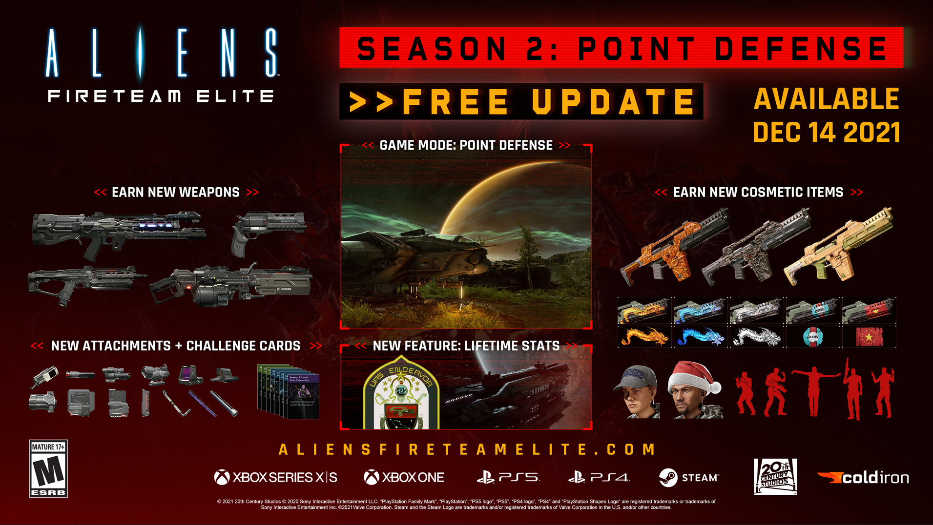 微软官方宣布《异形:火力小队》将于12月14日正式登陆PC和主机的Xbox Game Pass,同时上线当天还将推出第二赛季的内容,加入新的游戏模式,新的武器,皮肤,挑战卡和查看自己属性的方法。