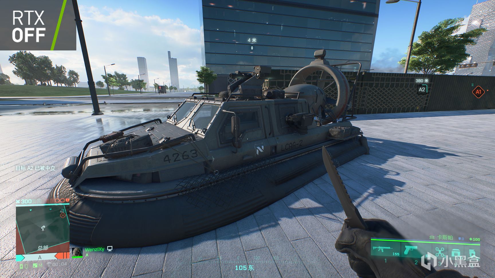 就拿游戏中的气垫船来举例对比,光追环境光遮蔽反映的是一个真实的暗部表现,使画面更加有层次感,具体到气垫船上的驾驶窗、发动机、烟雾炮塔甚至远处的树木都是这样去反映,这是一个整体画面氛围感的体现,相对反射层面更具有普遍性,毕竟能反射的部分比暗部的部分要少很多很多。