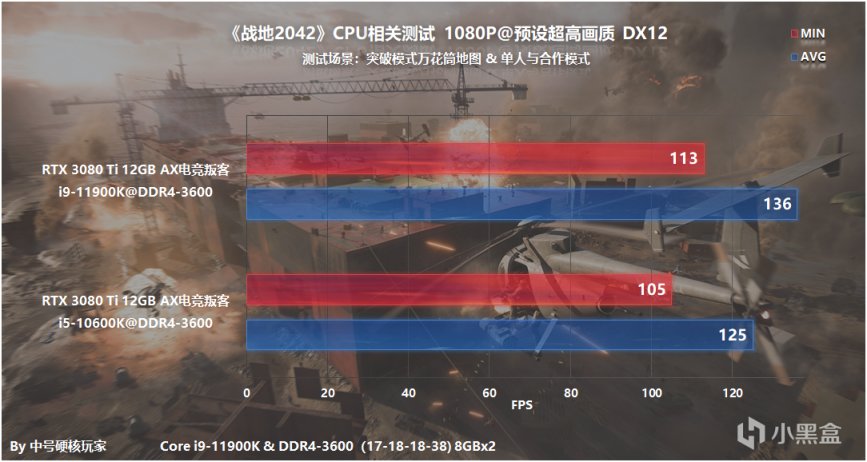 CPU测试使用i9-11900K关闭核心和调整频率来模拟,六核十二线程的规格性能相当于超频之后的i5-10600K,内存频率也是搭配的DDR4-3600频率测试的,就是用正常的i9-11900K来对比,因为寒霜引擎其实对于CPU核心和线程数有要求的,这里就没必要测试四核八线程的规格了,并且征服模式拥有128人的战场规模,多少会对CPU性能也有硬性要求。