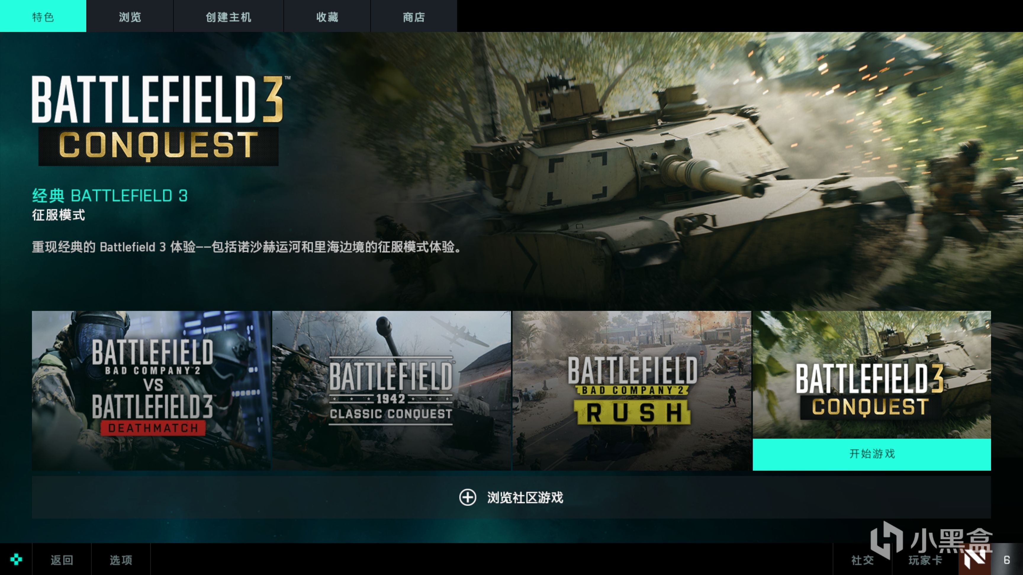 本作就是没有单人剧情部分,加上《战地》系列的方向其实就是主打多人游戏,所以进入游戏没有马上开玩,就看到社区游戏这一项,里面有《战地1942》、《战地:叛逆连队2》以及《战地3》的一些经典地图重制,并且在各种建模、武器手感也近似旧作,反倒个人觉得这部分EA做得挺好的,买一送三完全不亏好吧。