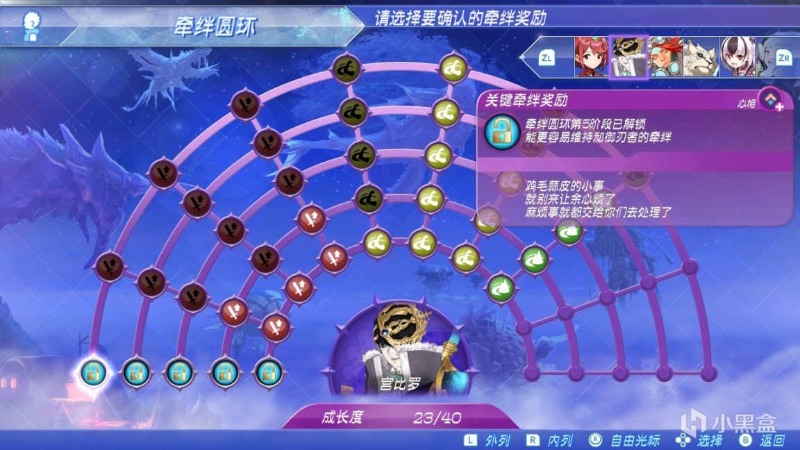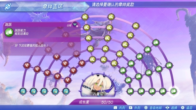 你以为抽到就万事大吉了吗?并不是,异度2里有一个极其重要也是极其费时费力的系统,羁绊圆环。羁绊圆环的开环过程无非就是,解锁关键羁绊,再将分支下的小任务完成,说起来还是蛮简单的,但实际上麻烦的一批。