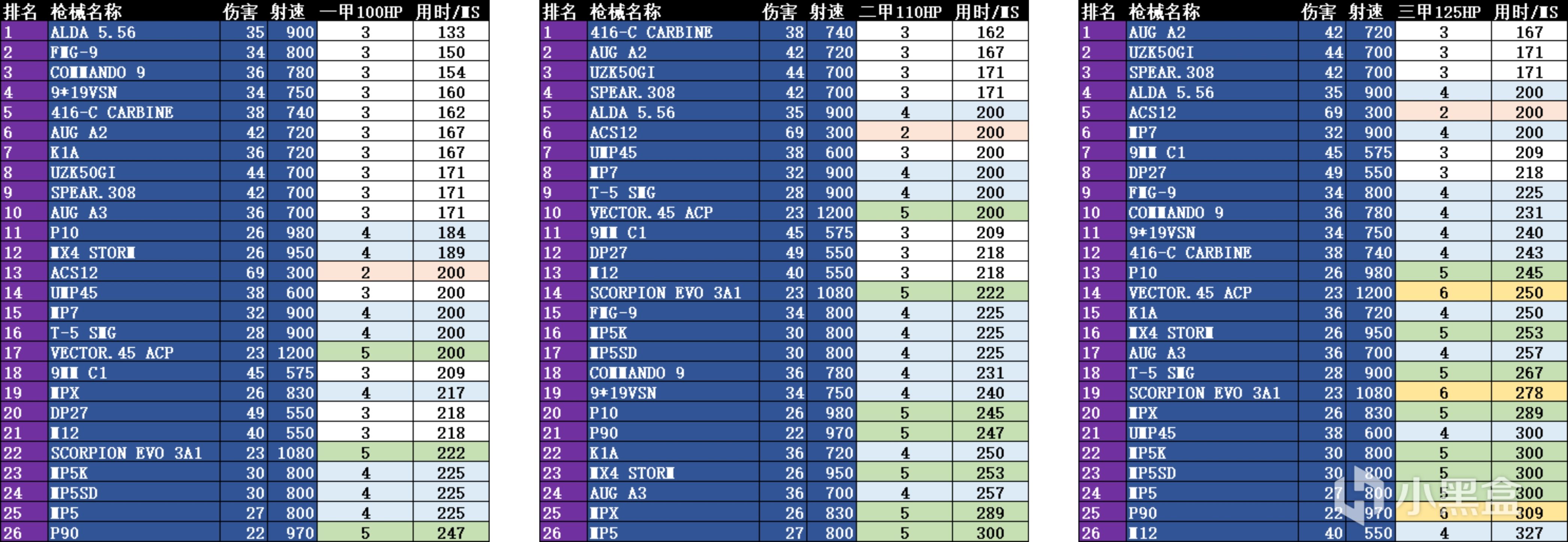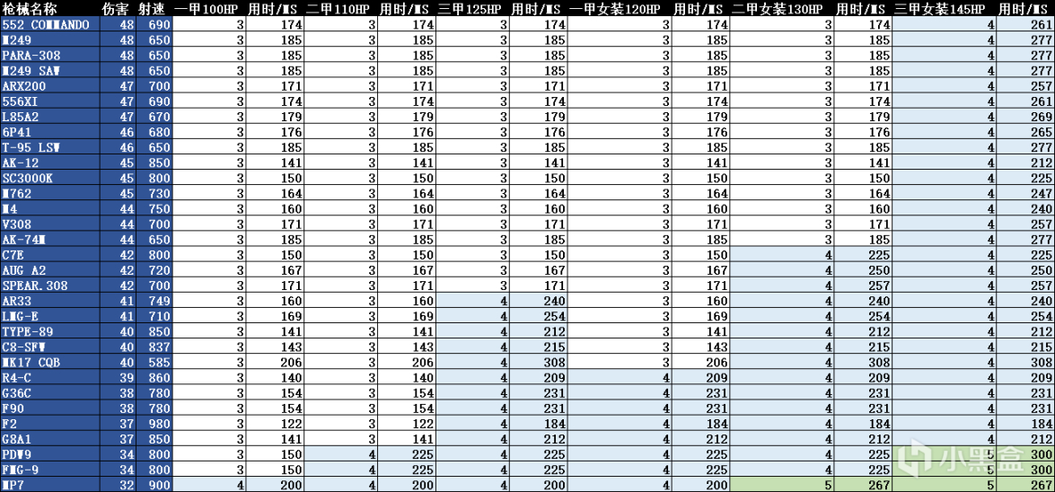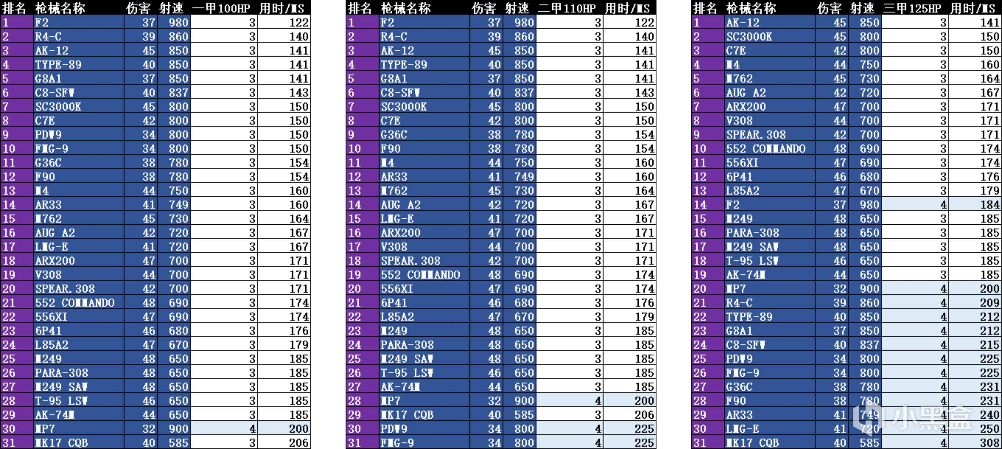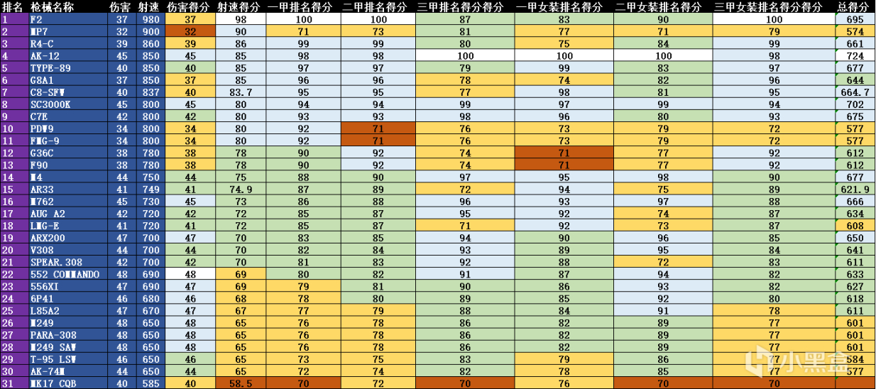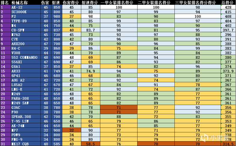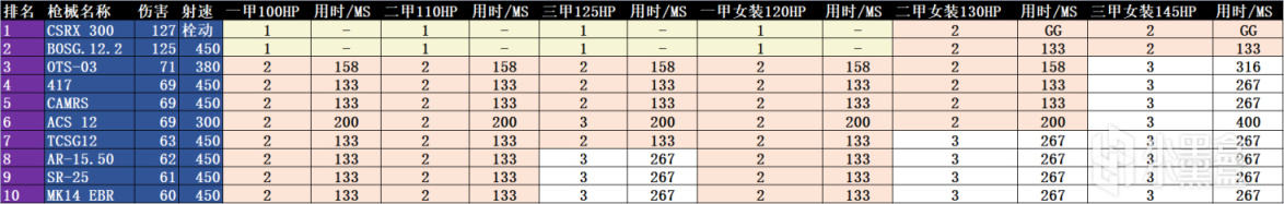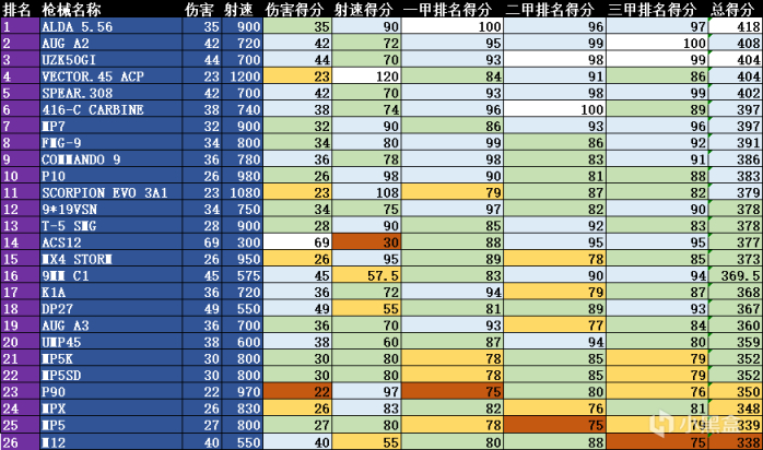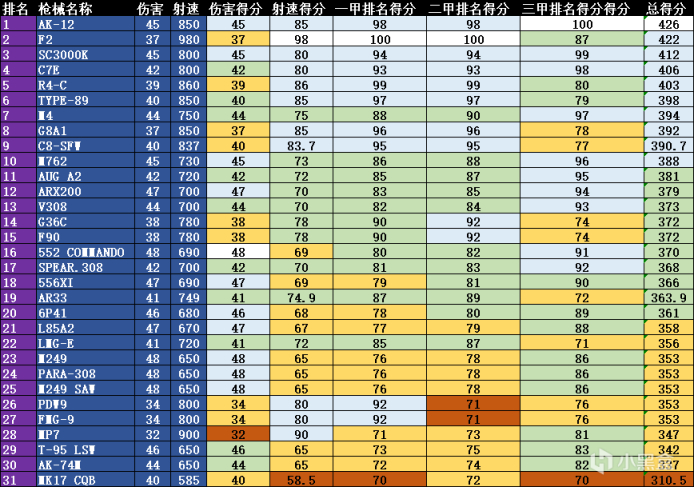 以上表格和排行不具备专业性,只是每把枪应对各种甲数防守方时的泛用性排行。各位盒友看着乐呵乐呵就算了~
