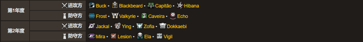 注意:今年(第六年)的干员任何版本都不包含,第一排的基础干员也都不包含,需要自己打声望购买。除了基础干员,所有干员的发售价格为25000声望,每过一整年会降低5000声望的售价,但最低降到10000声望。如第五年第一赛季新出的干员会在第六年第一赛季降5000声望,以此类推。基础干员为1000声望,非常容易得到,两三把就能打一个出来。