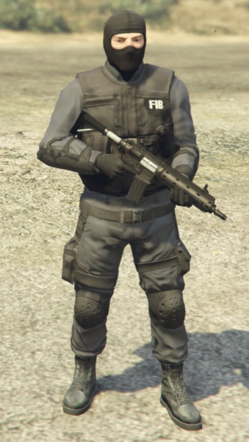 第三个是战术部门,该部门的探员着装和国安局特工一模一样,但防弹背心上的标识是“FIB”而不是“POLICE”,这表明此部门不受当地警方的指挥,而只听从联邦调查局的命令。该部门基于现实中的联邦调查局特警队,后者通常只在极端情况(如人质事件等)下被派遣。然而,这些部队在洛圣都市不仅被用来保卫联邦调查局的总部,甚至连探员都可以临时调遣他们。这些部队可能参考了现实中联邦调查局的人质拯救队(Hostage Rescue Team/HRT),或者是增强特警队(Enhanced FBI SWAT)。