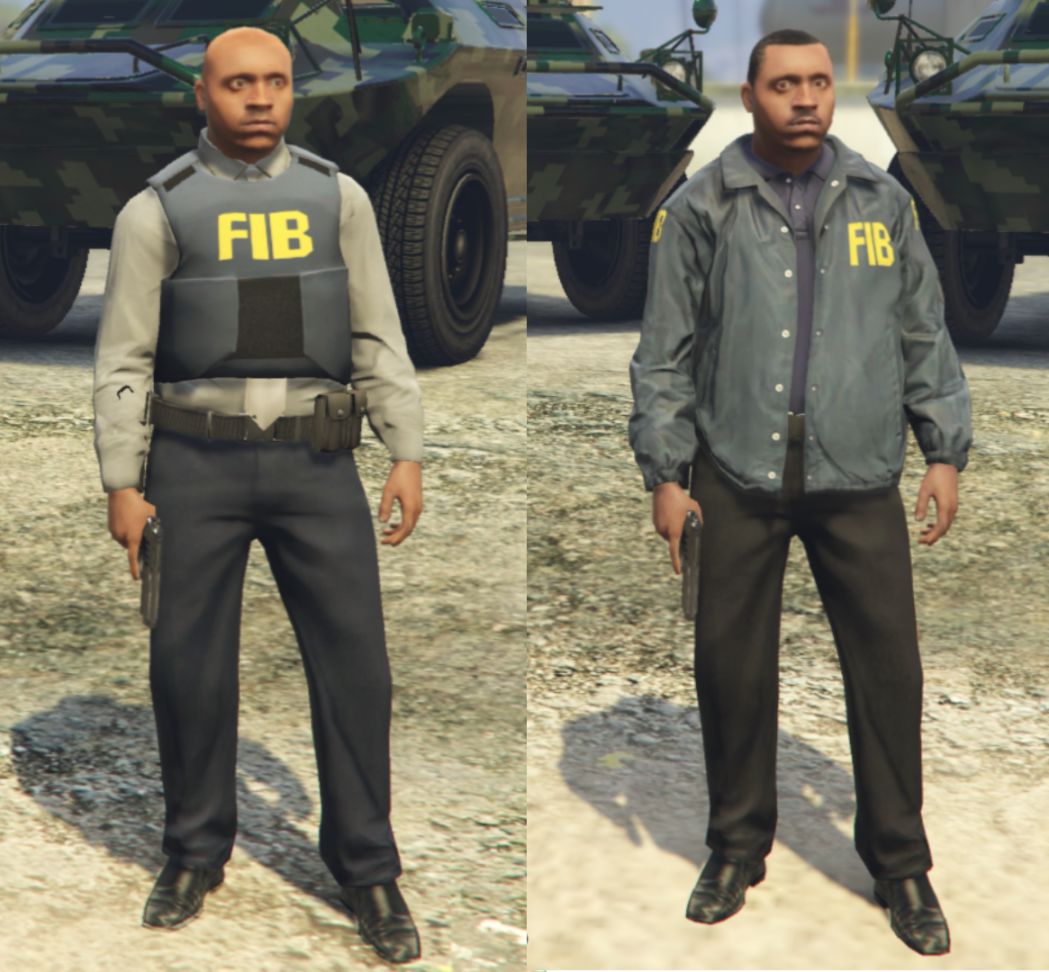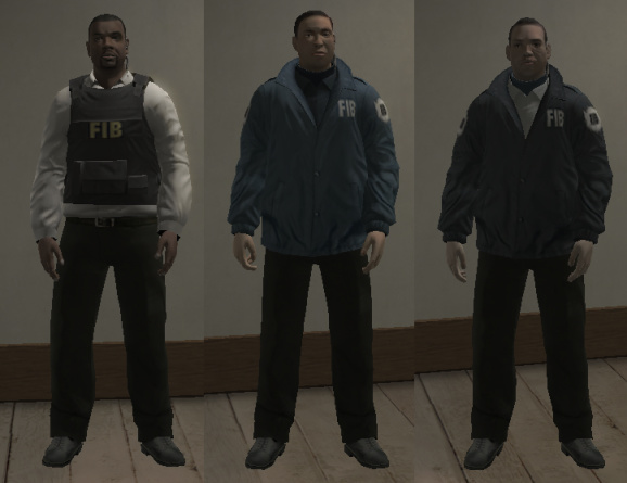 自由市的一些联邦调查局探员通常会配备防弹背心,但是大多数探员还是会在毫无防护装备的情况下行动。联邦调查局在自由市的探员通常是中年白人男性,他们一般穿着带有标识的蓝色夹克,也有探员会穿着黑色的防弹背心,脖子上挂着一副证件。但也有穿风衣的探员。洛圣都市和布莱恩县的联邦调查局探员则依据部门的不同而穿不同的服装。安全部门探员通常只穿燕尾服,外勤调查部门的探员则会穿着蓝色夹克或防弹背心。