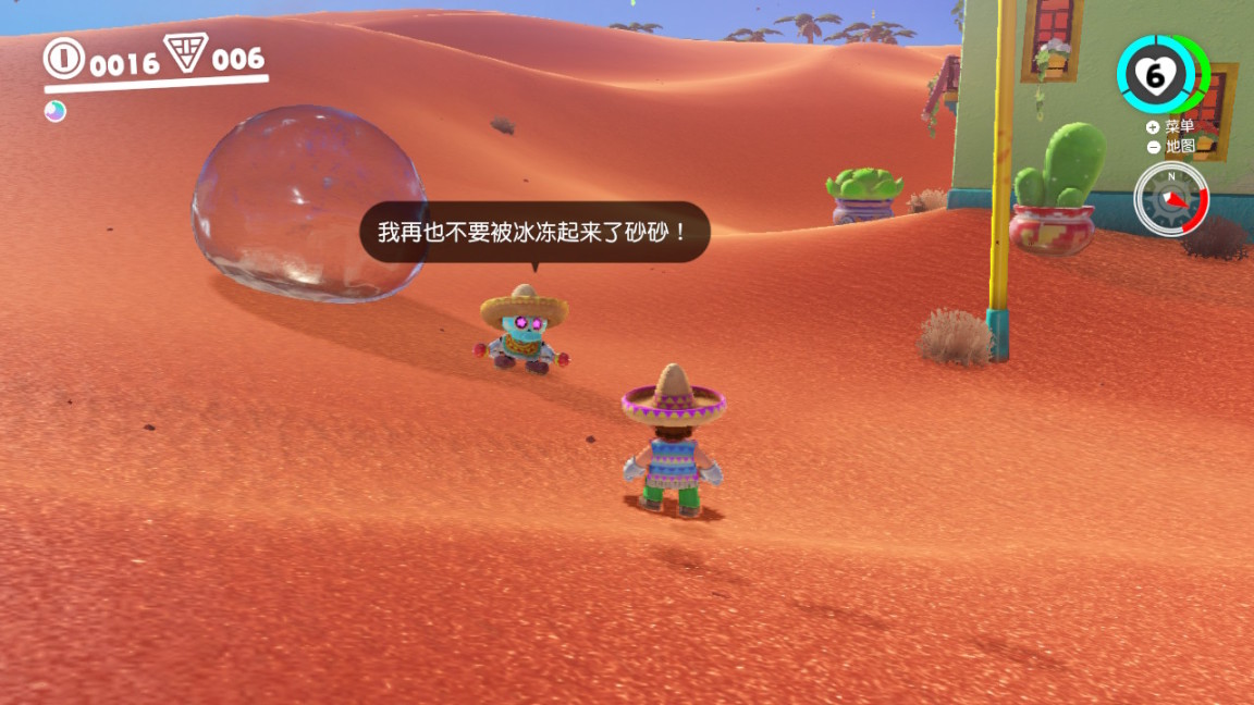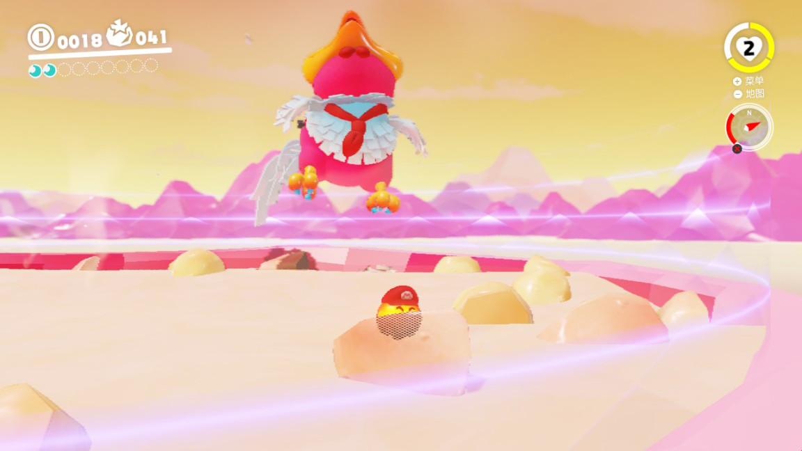 相较于道具众多、需要记招式的其他RPG,奥德赛的战斗系统更突出了“乐趣”二字。战斗场地一目了然,bgm活泼轻松,一般挺过精英怪的三轮攻击就可以过关,如果你死太多次,老任还会贴心地派出来自沙之国的商人在战斗点游荡,让你用50金币多买三条命回头再战。战斗过程也不需要过多指引,观察敌人的招式很容易就能找到应对策略。这时候就不得不再感叹一句,老任的引导是真的做得好啊!