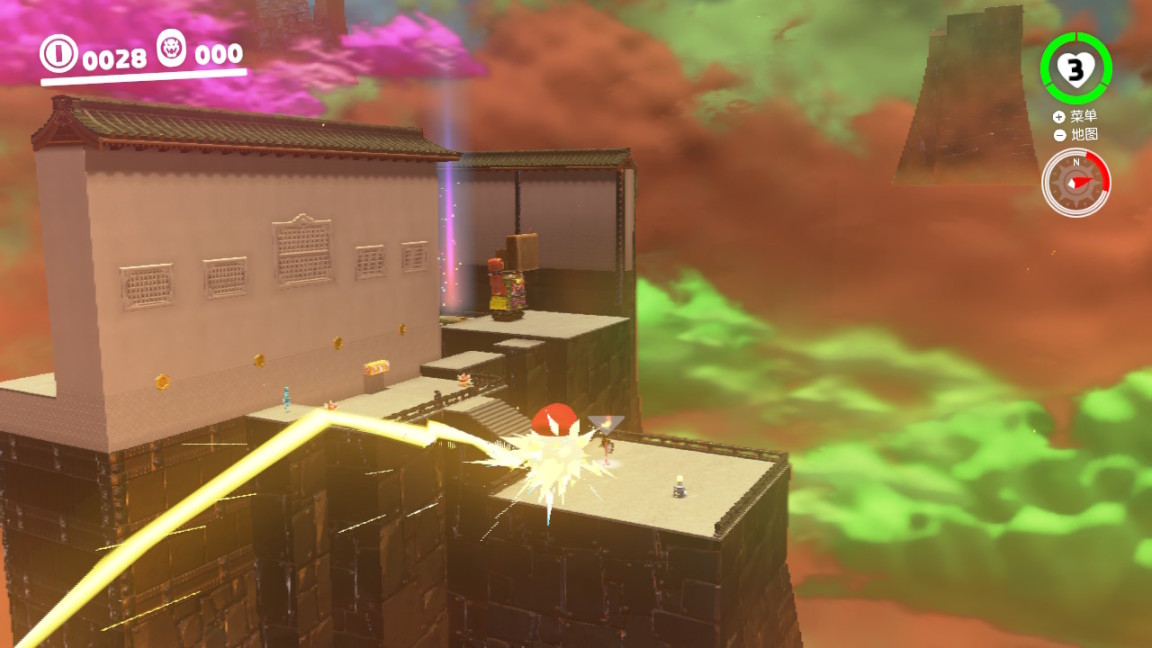 这里真的很推荐大家多多搜集月亮和紫币,踏足的地方越异想天开(屋顶,柱子顶端、墙壁内部),得到的奖励也会越丰富。当你深入探索某个地点,转身看到亮闪闪的紫币时会会心一笑:原来游戏的设计者早就料到你会来这里了。玩家和创作者有这样的共鸣,属实已经被老任拿捏得明明白白了。
