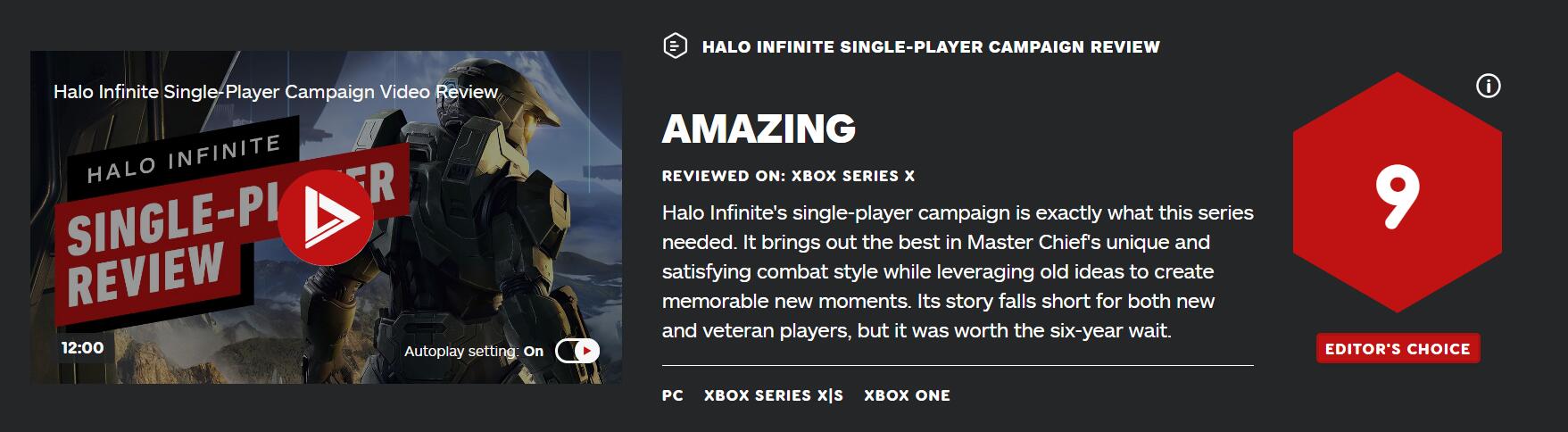 《光环:无限(Halo Infinite)》战役模式即将在12月8日正式发售,今天游戏的媒体评分正式解禁,IGN为本作打出了9分的超高好评。