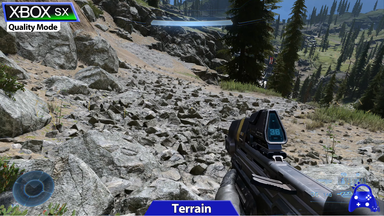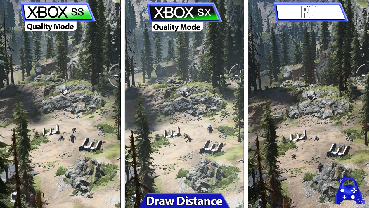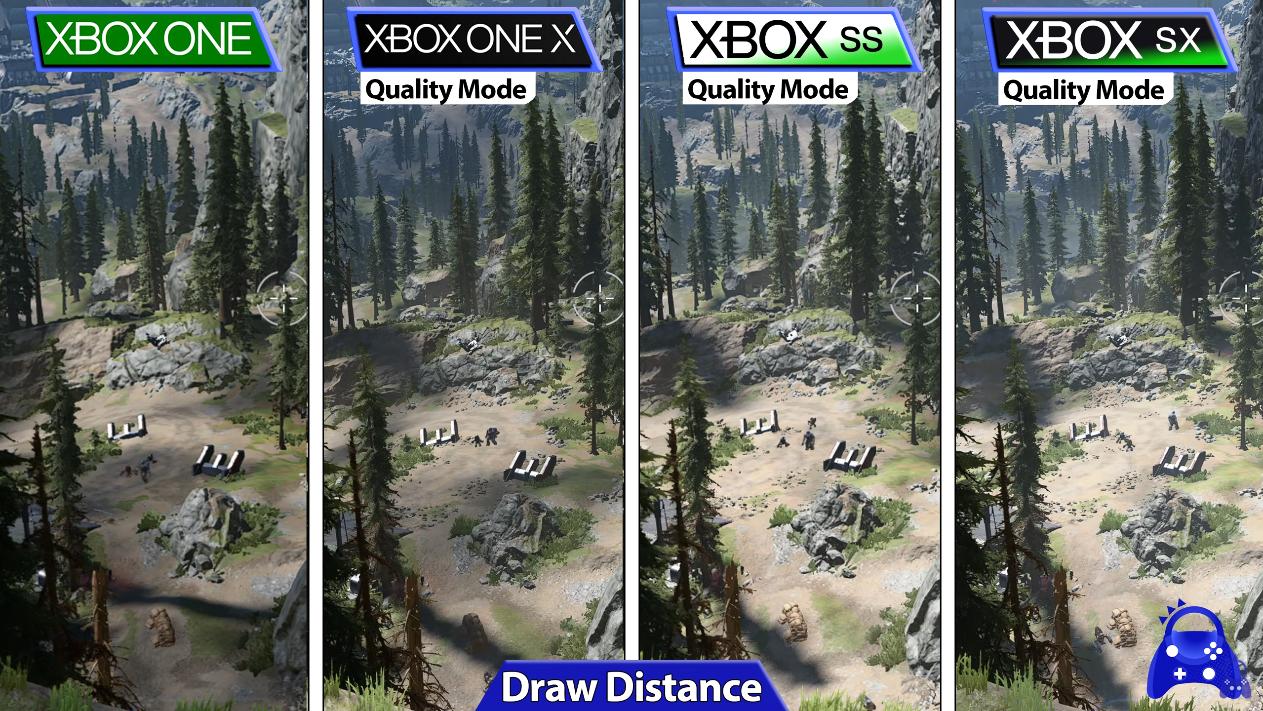 - PC版的绘制距离略高,XSS与Xbox One类似,但在部分元素(树木)上XSS优于Xbox one,而在另一些(地面岩石),Xbox one 优于XSS。