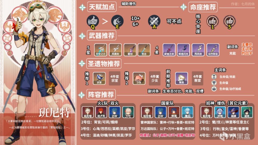 班尼特,火属性单手剑,拥有“6星战神”的辅助型角色,适配所有缺攻击力的主c,一个大招随随便便加七八百点攻击力。如果你的主c缺伤害,那就带个班尼特准没错(压血角色除外)!一口轻松奶4-5000血,能乃能增伤,e技能还能破盾,旅行者征服提瓦特大陆必备神辅。