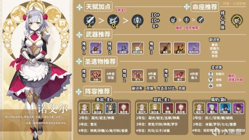 诺艾尔是岩属性大剑角色,突破属性为防御力百分比,是一个后期培养型角色,十分吃练度,对圣遗物要求高,使用锻造武器白影剑即可。新手期开荒缺主C可使用,或大佬生草资源溢出时培养。